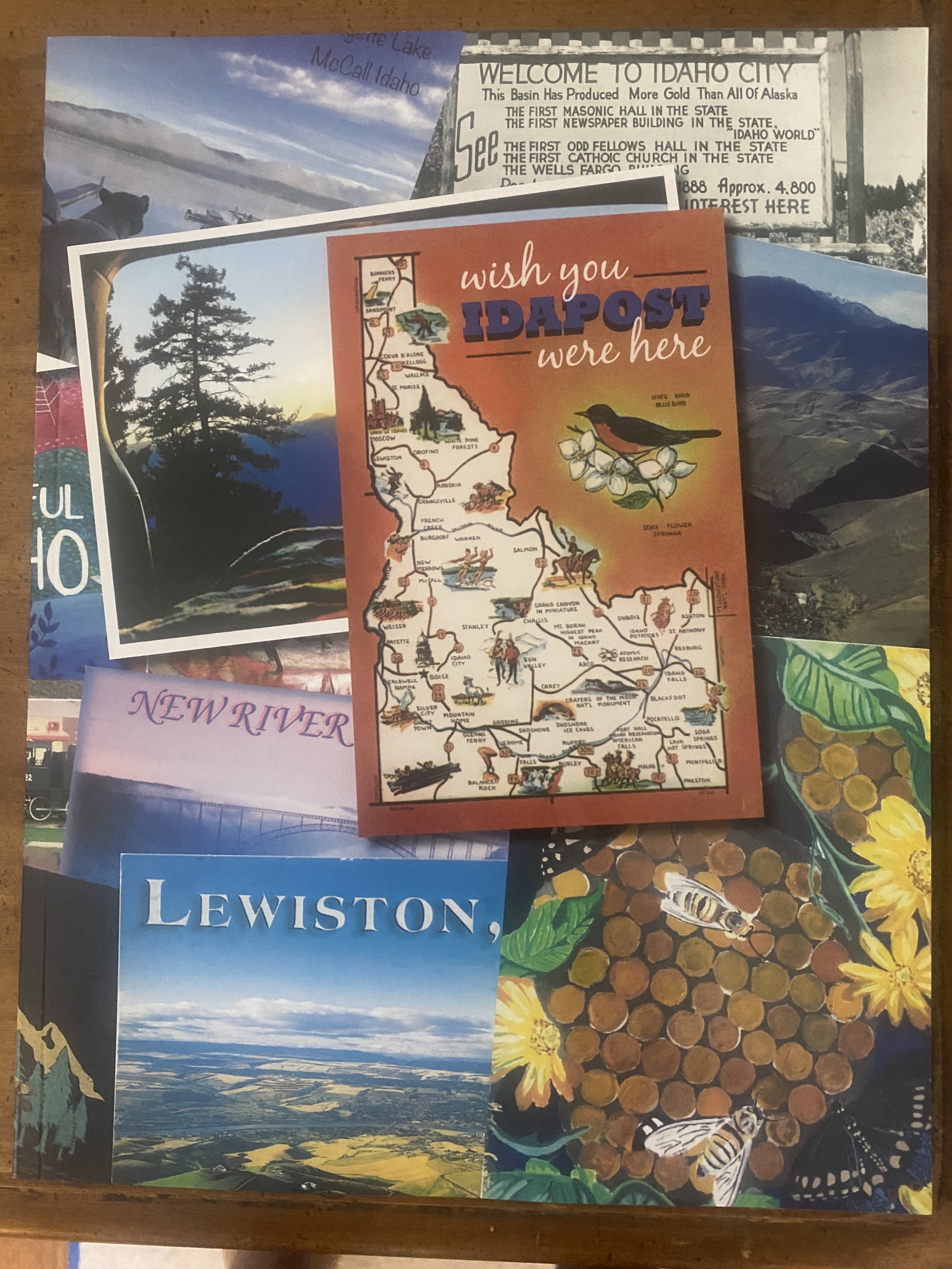 I love finding writing communities. I first met CMarie Fuhrman at Arts By the People 2 years ago in a writing workshop. She invited us to participate in IdaPost, Wish You Were Here, a pen pal project she conceived “investigating place through story – our place, this place, the place of the past and even of the future.” This was a collaboration between the Idaho Commission on the Arts and CMarie, the Idaho Writer in Residence, who recently completed her tenure. I was happy to jump in. I met two fantastic writers over 2 years, my pen pals–Peggy Larsen and Andrea Eldridge. All the pen pals contributed to a publication, as a culmination to our project based on our postcard prompts. Thank you CMarie, Peggy and Andrea for this creative adventure and welcoming me, a New Jersey resident, into your Idaho community.