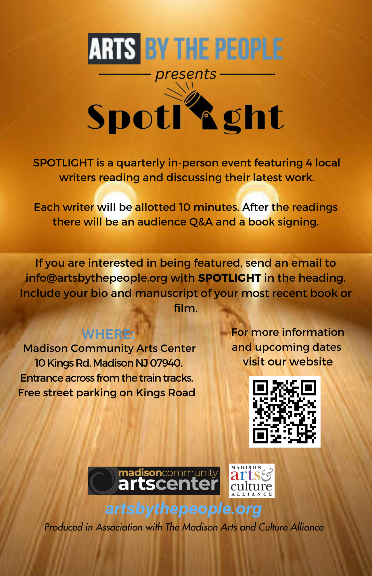 SPOTLIGHT is a quarterly in-person event featuring 4 local writers reading and discussing their latest work. Q&A and book signing to follow. Featuring Margaret R. Sáraco, Christine Stoddard, Mary Brancaccio, and Deborah Gerrish. (The venue is barrier free.) For more information visit ARTS By The People website: https://www.artsbythepeople.org/pages