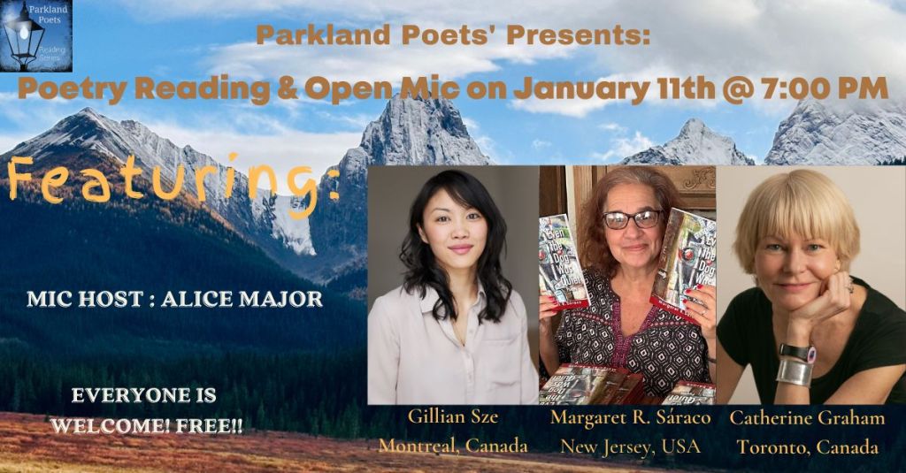 I will be a featured reader with Gillian Sze and Catherine Graham for Parkland Poets (passcode is 2024) on Thursday, January 11, 2024, from 9-10:30 pm ET. (Note” the flyer states it is at 7:00 pm, but that is MST.) PLEASE JOIN US. Open mic available. Sign up during event. (See the flyer below.)