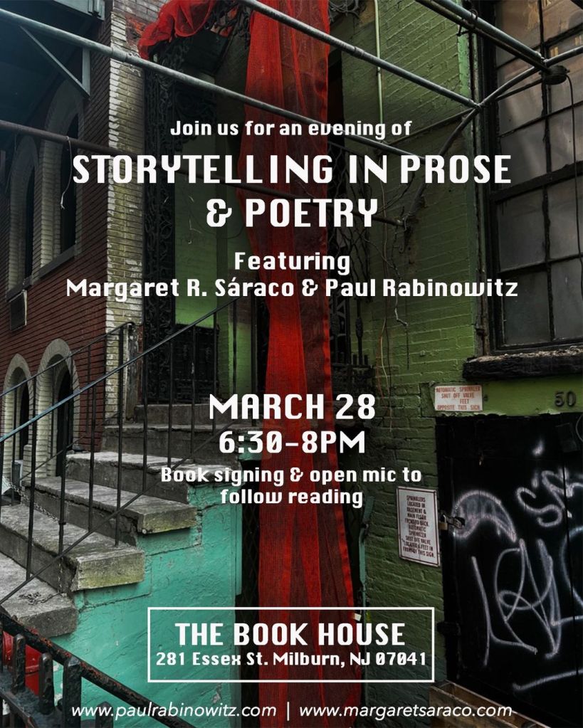 THIS THURSDAY! Join Paul Rabinowitz and me at The Book House in Milburn, NJ for Storytelling in Prose & Poetry, March 28th from 6:30-8 pm. Open mic and book signing to follow the reading. Location: 281 Essex St, Milburn, NJ.