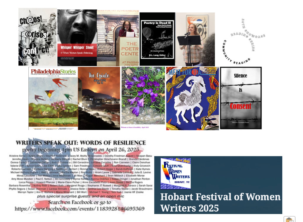 4/26 Writers Speak Out: Words of Resilience. Open mic. Over 85 poets. Surprise guests. Reading begins at 1 pm EST (10 am PST). It is a happening. Short sets. I should be going on sometime between 3:15 and 4 pm EST (12:15 and 1 pm PST).