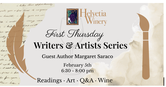 The First Thursday Writers & Artists Series is a monthly event designed to bring together writers, painters, photographers, poets, and people who appreciate them, in the inspiring setting of Helvetia Winery. This series will provide a welcoming space for people to connect, share their creative work, and build lasting artistic and professional communities Each month we host a speaker to kick off the evening. This month Margaret Sáraco will be our guest. This is an in-person free event!