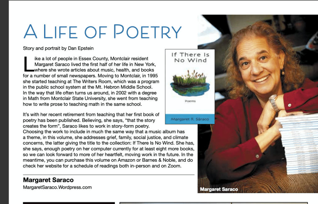 Margaret R. Sáraco is a writer, activist, and retired educator. Her poetry and short stories have appeared in many anthologies and journals. Margaret was a semi-finalist in the inaugural Laura Boss Narrative Poetry Contest in 2022. She received Honorable Mention in the Allen Ginsberg Poetry Contest in 2020 for her poem, “The Unlocked Door.” The New Jersey Covid-19 Storytelling Project selected two of her poems as part of a historical record of artwork across the state. A member of Writing the Land, she helps to raise awareness of the importance of land conservation through her poetry. If There Is No Wind, her first full length poetry collection, will be published this fall.