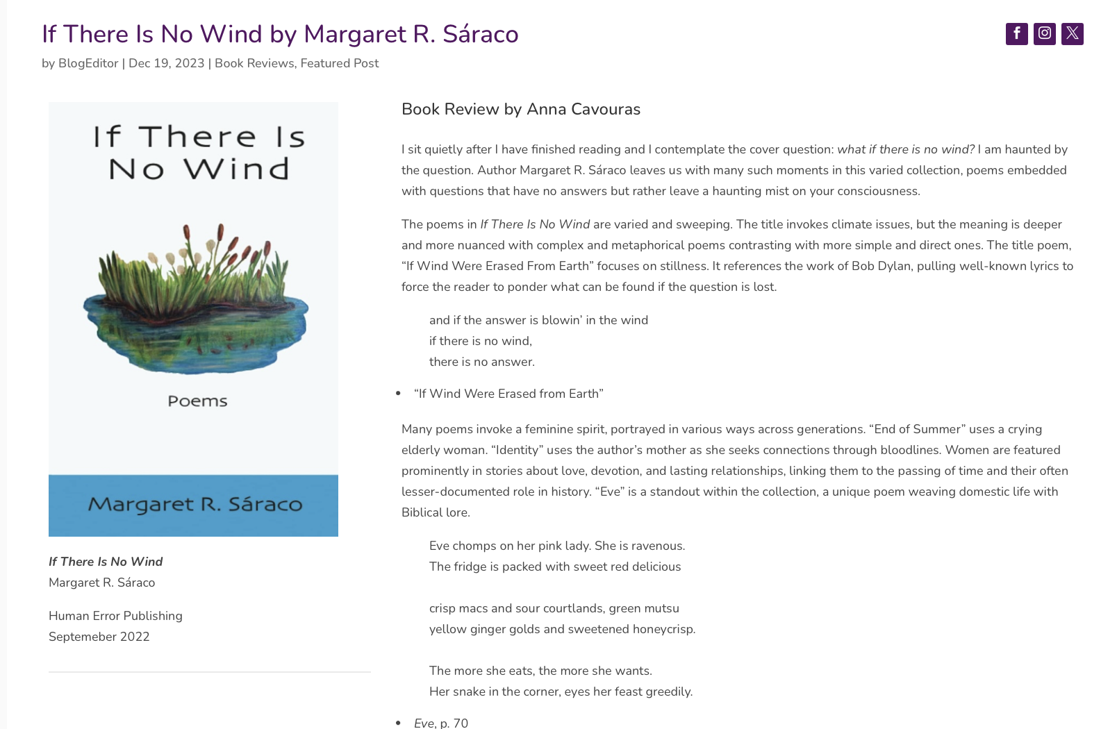 Thank you, Anna Covouras for reviewing my poetry book If There Is No Wind (Human Error Publishing, 2022) in Minerva Rising Press. I am both grateful and flattered. To read the entire review, click the link provided.