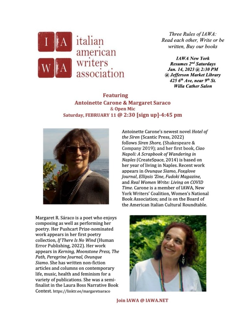 FEBRUARY 11: Italian American Writers Association (IAWA) Jefferson Market Library, 425 6th Ave., near 9th St. with Antoinette Carone, from 2:30-4:30 pm.